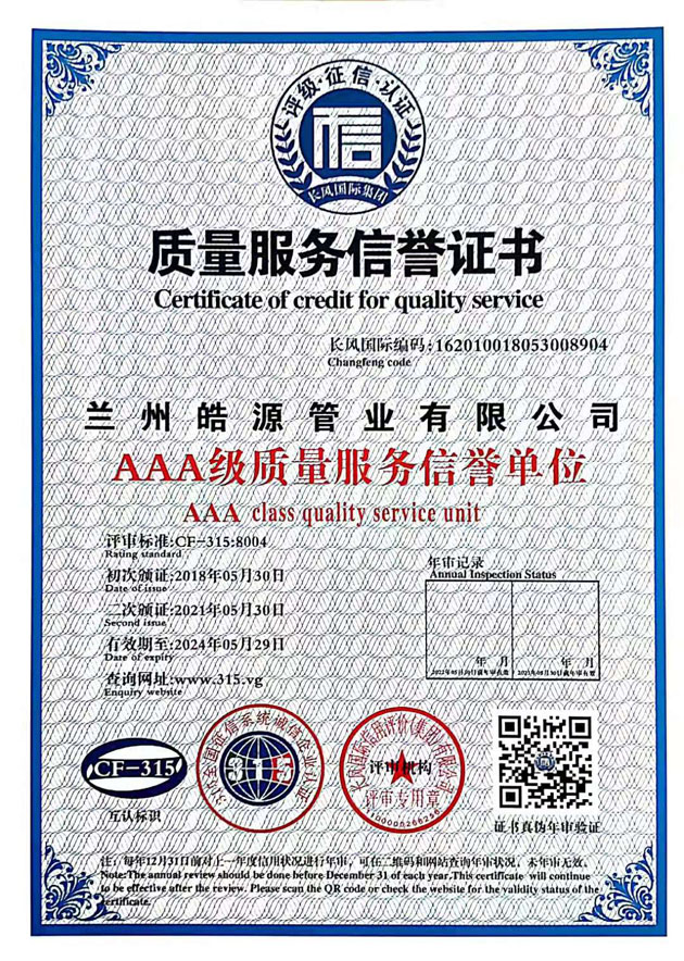 質(zhì)量服務(wù)信譽證書